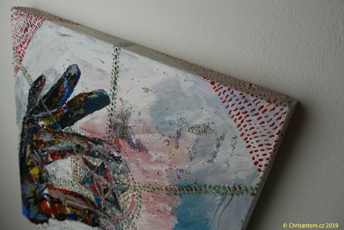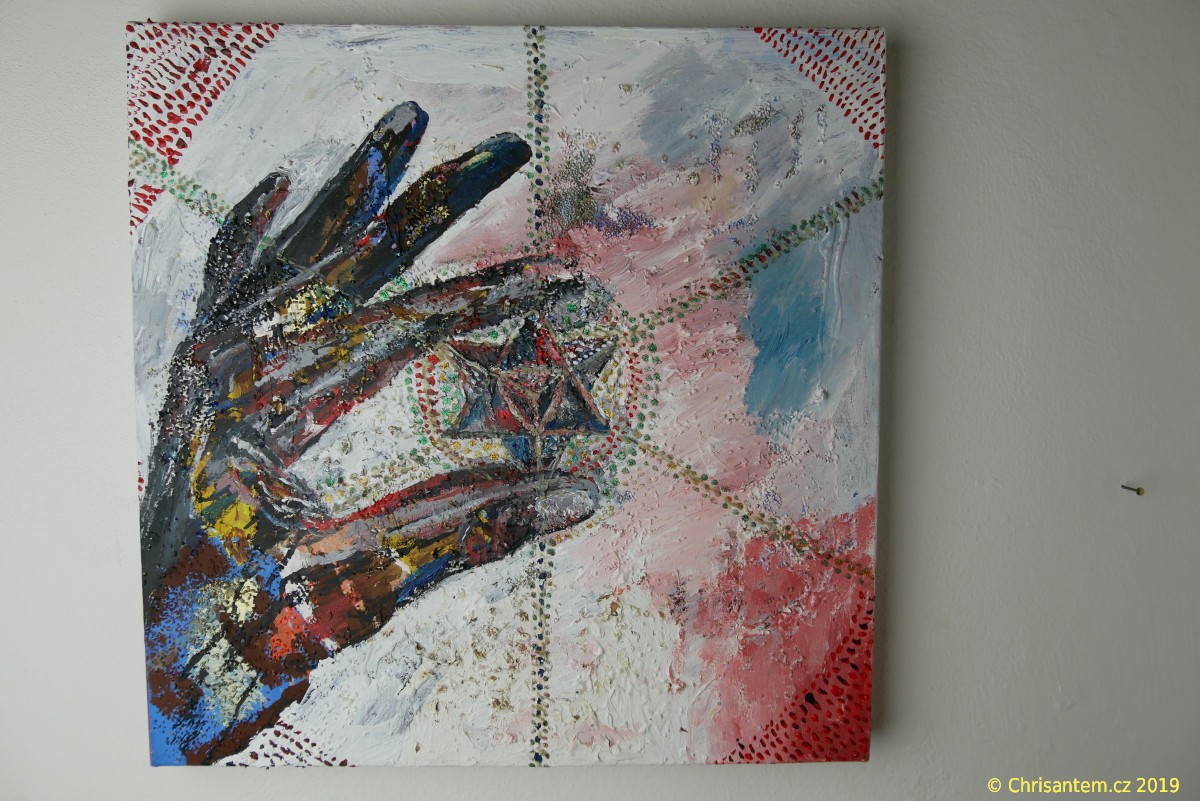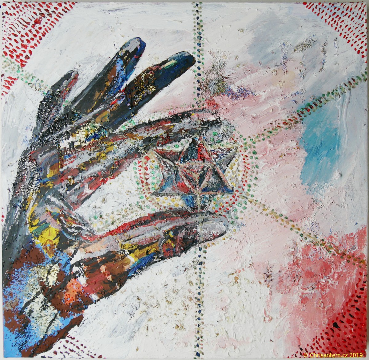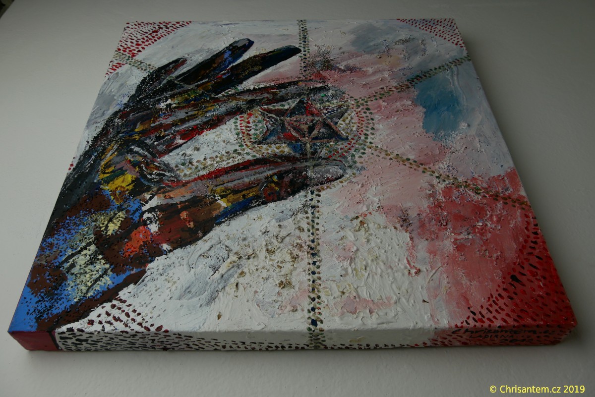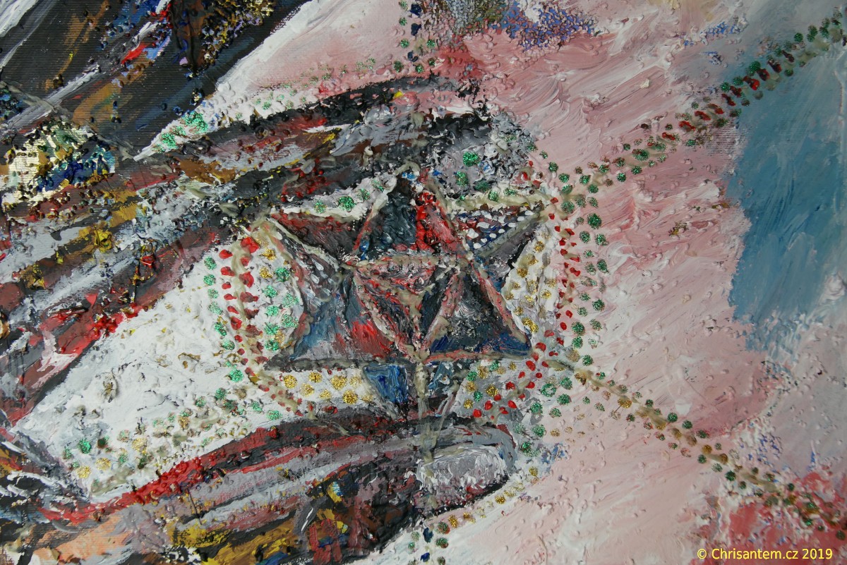 Chrisantem Macháček: Obraz „Nefilim Merkaba“, Akryl na plátně 50×50 cm, 2019